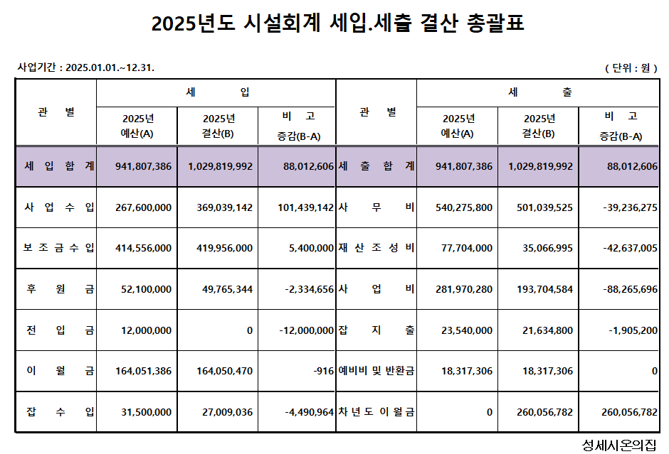 사회복지법인 및 사회복지시설 재무·회계 규칙 제19조에 의거하여 본 시설의 2025년도 세입·세출 결산서를 아래와 같이 공고합니다.