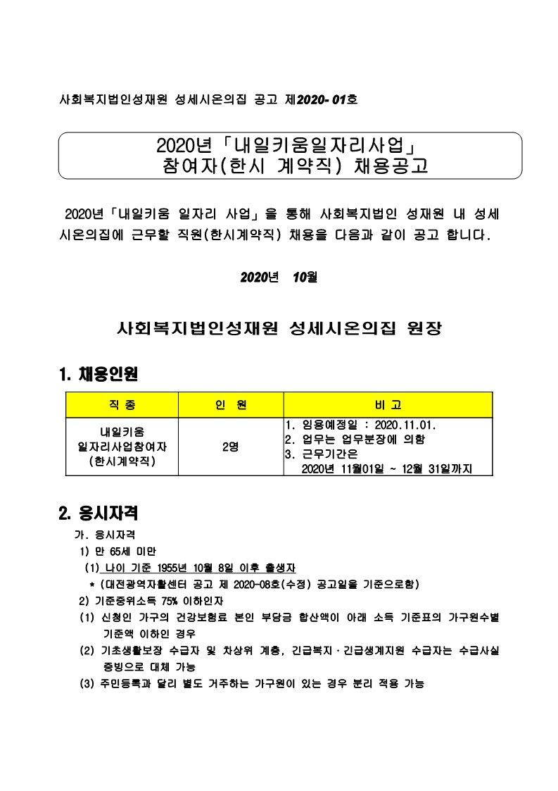 2020년 「내일키움일자리사업」 참여자(한시 계약직) 채용공고