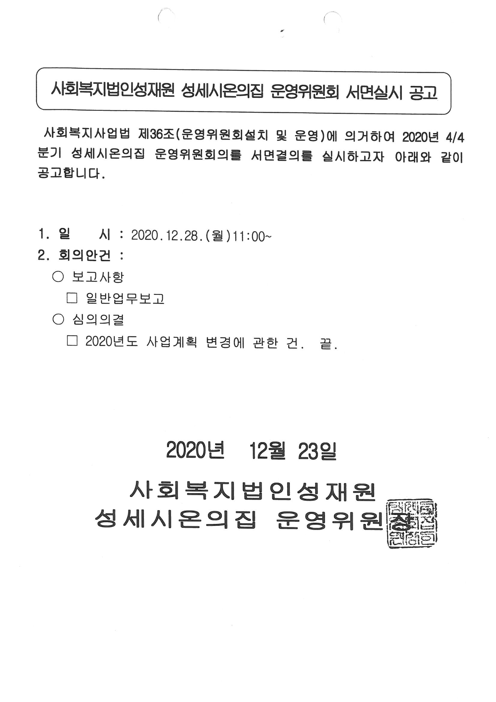 2020년도 4/4분기 성세시온의집 운영위원회 개최공고