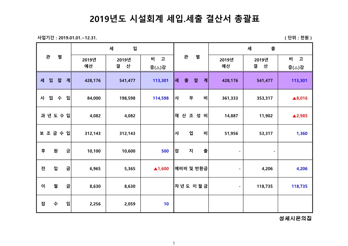 2019년도 시설회계 세입·세출 결산서