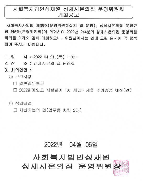2022년도 2/4분기 성세시온의집 운영위원회 개최 공고