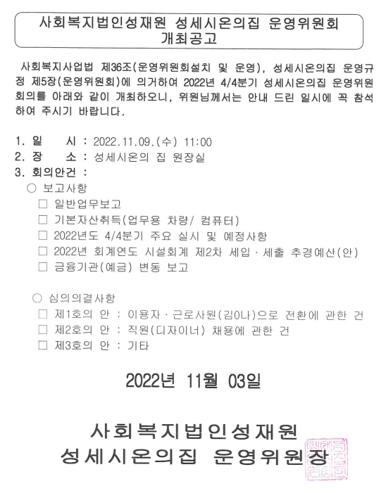 성세시온의집 4/4분기 운영위원회 개최공고