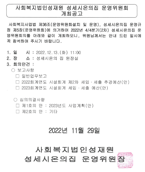 성세시온의집4/4분기(2차) 운영위원회 개최공고