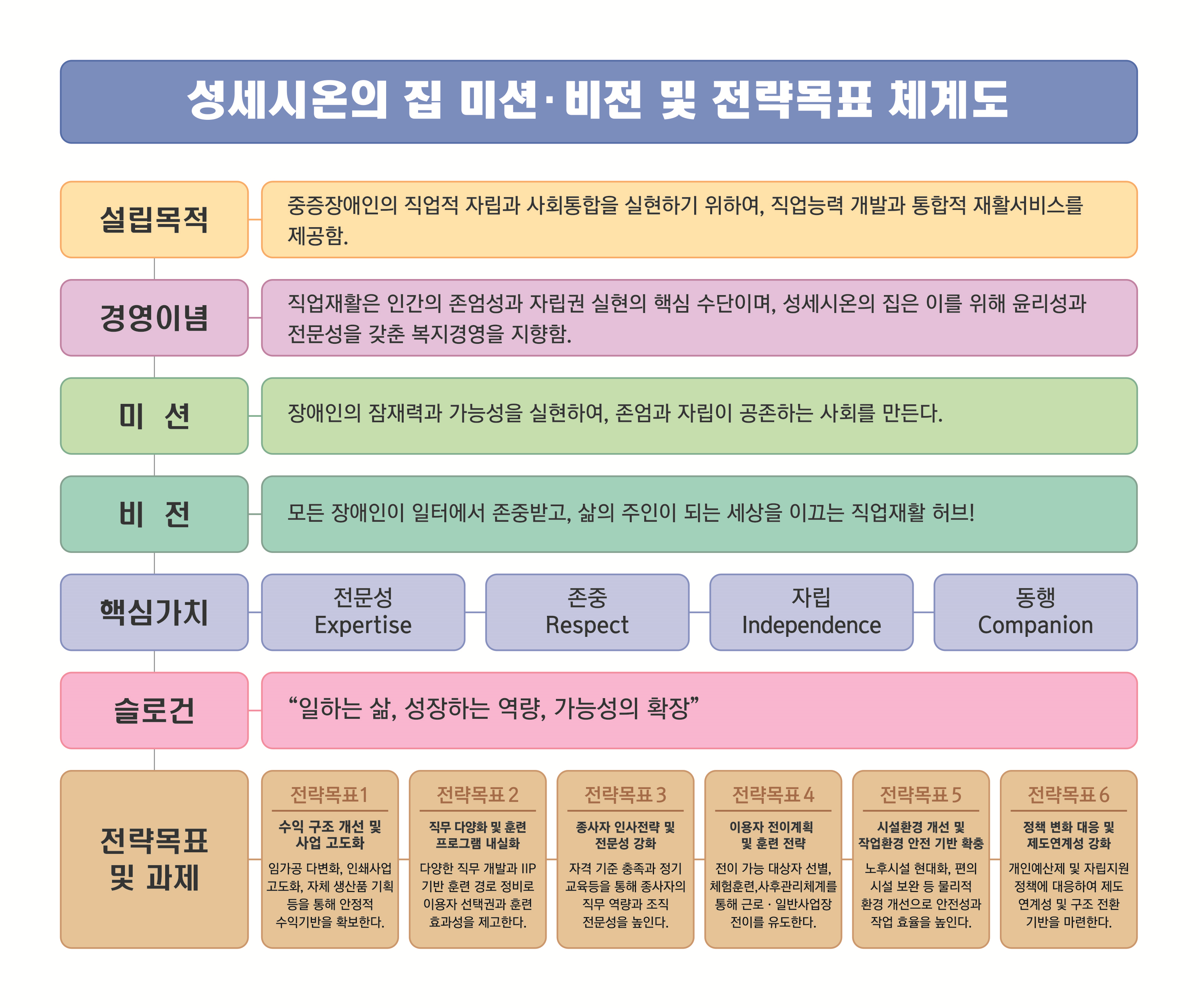 성세시온의집은 「전문성 · 존중 · 자립 · 동행」의 핵심가치를 토대로, 2025~2030년 동안 수익구조 개선·직무다양화·전문성 강화·이용자 전이·환경개선·정책대응의 6대 전략목표를 중심으로 지속가능한 직업재활체계를 구축합니다.
